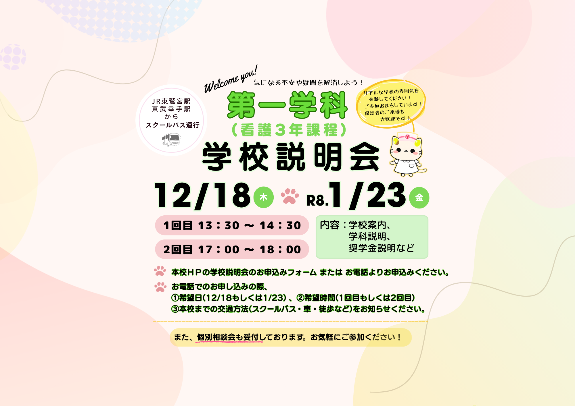 第一学科~看護3年課程~ 学校説明会(R7.12/18・R8.1/23)追加開催につ...